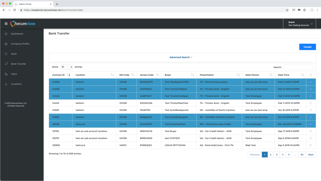 From the Navigation menu on the left, click the Bank Transfer tab. In this menu, please select the transaction(s) that you would like to transfer to your connected Bank. Once selected, click on the Transfer button.